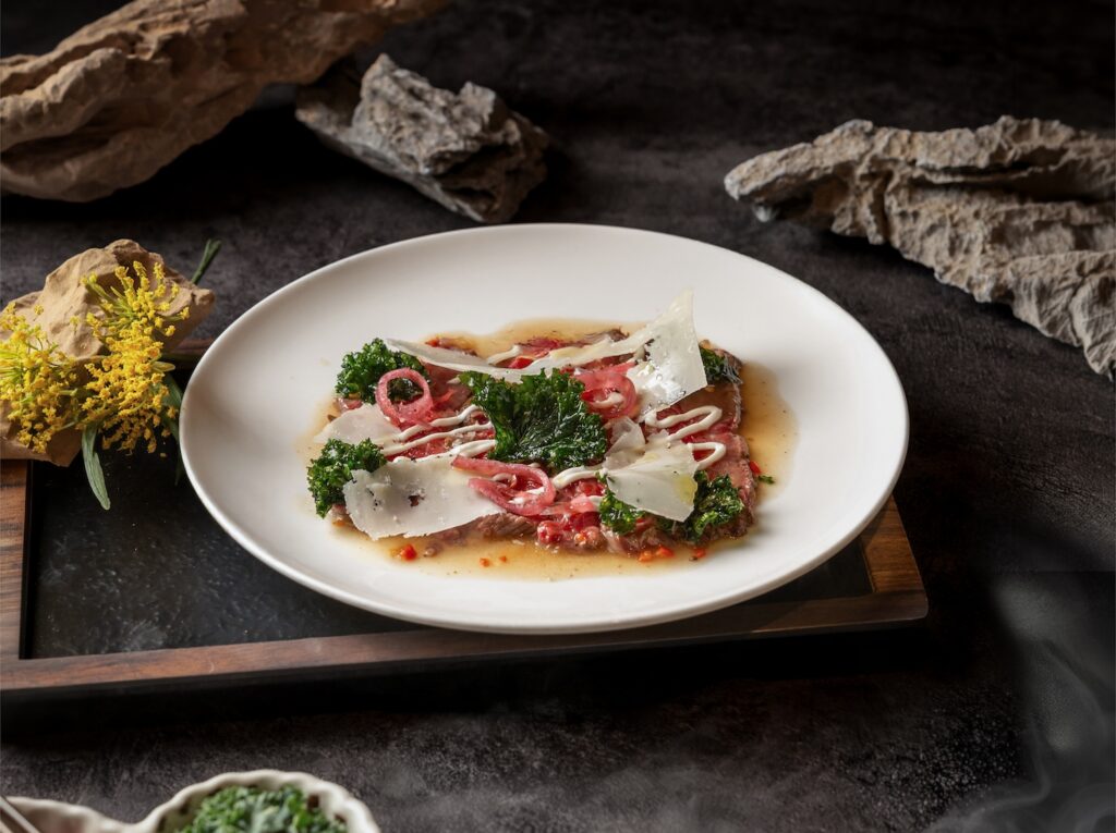 Italian-style Wagyu tataki with ponzu, Parmesan, kale and chilliWagyu Ravioli del Plin – HK$140